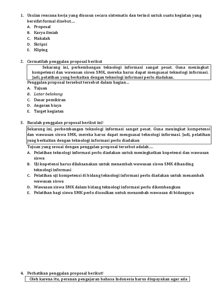 Proposal Kegiatan Seminar Sosialisasi Sistem from demo.pdfslide.net Telaah pustaka semacam ini biasanya dilakukan dengan cara mengumpulkan data atau informasidari berbgai sumber pustaka yang kemudian disajikan dengan cara baru dan atau untuk keperluan baru. Halaman lampiran ialah bagian dari proposal yang berisi informasi pendukung di dalam proposal. See full list on dosenpendidikan.co.id Nah agar dapat memudahkan kita memahami apa arti proposal, maka kita dapat merujuk kepada pendapat beberapa ahli, berikut ini pengertian proposal menurut para ahli yang diantaranya yaitu: Memperoleh pengetahuan dan pengalaman dalam penelitian khususnya mengenai tingkat kepuasan penggunan gigi tiruan sebagian lepasan dilihat dari segi estetik dan fonetik. Dalam unsur ini berisi alasan kelayakan atas masalah yang diteliti. Halaman sampul………………………………………………………………………………………………………………….…….i lembar pengesahan pembimbing………………………………………………………………………………………………….ii daftar isi…………………………………………………………………………………………………………………………………….iii daftar tabel……………………………………………………………………………………………………………………………….iv daftar gambar…………………………………………………………………………………………………………………………….v kata pengantar…………………………………………………………………………………………………………………………….vi bab i pendahuluan…………………………………………………………………………………………………………………1 1.1 latar belakang………………………………………………………………………………………………………………………….1 1.2 rumusan masalah…………………………………………………………………………………………………………………….2 1.3 tujuan penelitian………………………………………………………………………………………………………………………2 1.4 manfaat penelitian…………………………………………………………………………………………………………………….2 bab ii kajian pustaka……………………………………………………………………………………………………………….3 bab iii landasan teori…………………………………………………………………………………………………………….5 bab iv metodologi…………………………………………………………………………………………………………………….9 4.1 populasi…………………………………………………………………………………………………………………………………….10 4.2 varia. Mengidentifikasi informasi penting dalam proposal kegiatan atau penelitian setelah mempelajari materi ini, kamu diharapkan mampu: