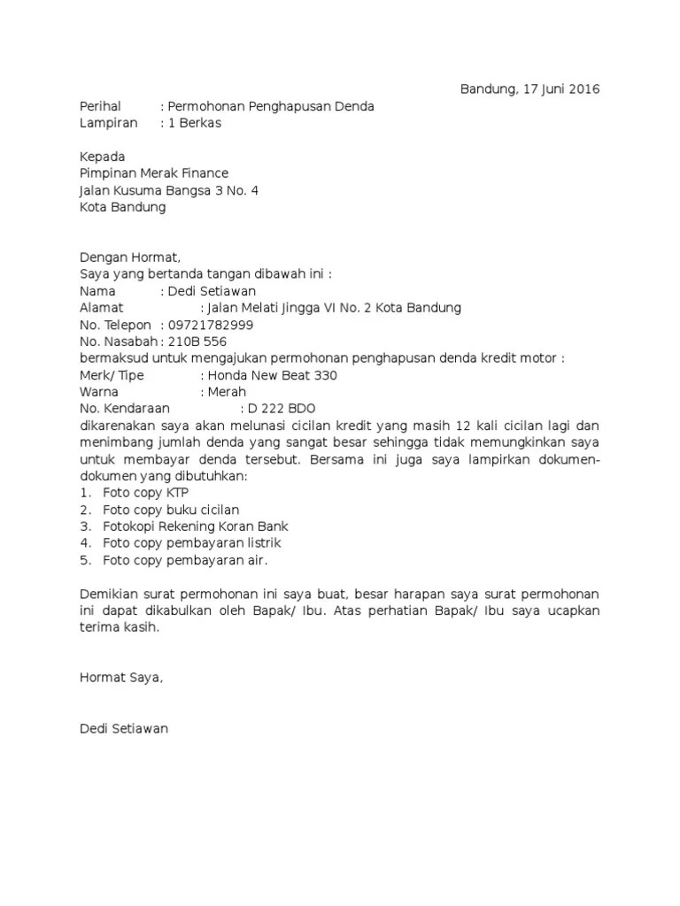 Contoh Surat Permohonan Keringanan Denda Adira - Surat Permohonan Keringanan Denda Masnurul : contoh surat permohonan keringanan pelunasan kredit bank.